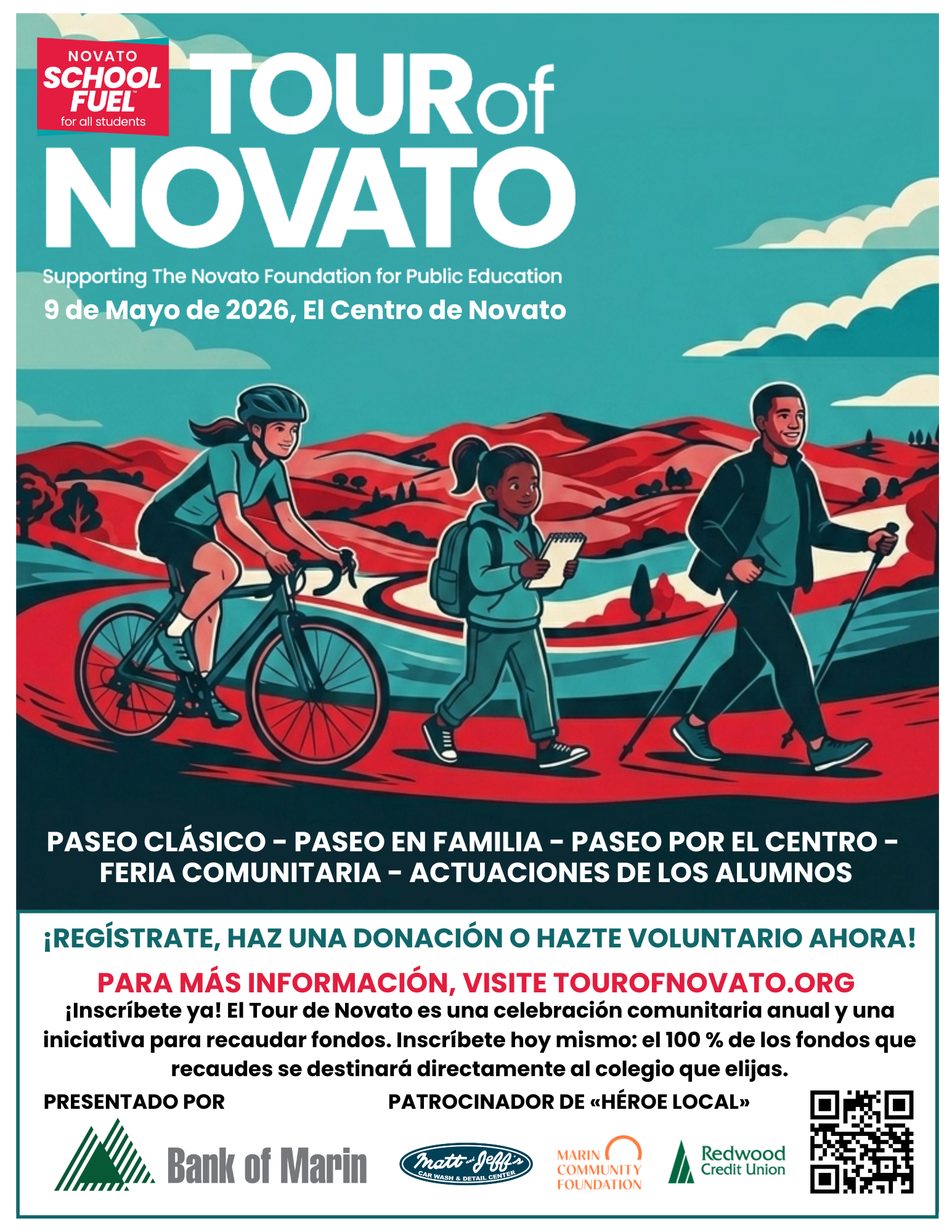 The Tour of Novato is an annual Novato-wide celebration of our schools, and a fundraiser to support them. This year, the event will return to Downtown Novato for a Community Fair celebration on Sherman Ave. and the Town Green. Choose from a Family Ride, a Classic Ride, or Downtown Walk. 100% of the money you raise goes to your designated NUSD school or club. There will also be weekly challenges and prizes. This is a great way to have some family fun and learn more about the Novato schools and community.